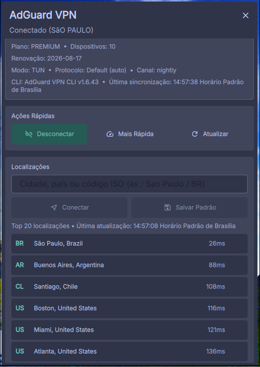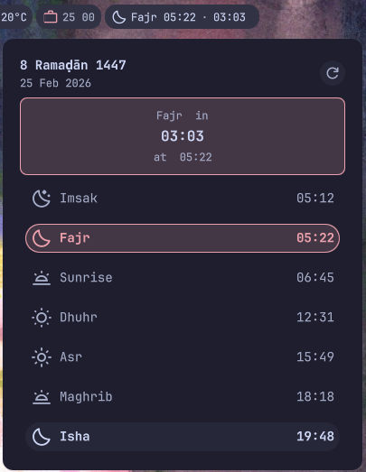 Display up to 5 timezones on the DankBar. Toggle between showing all at once or cycling one at a time at a configurable interval.