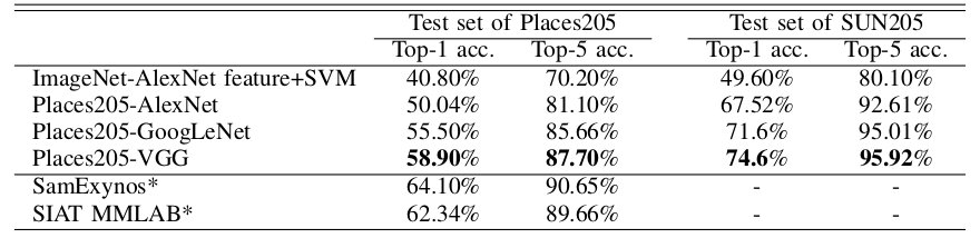 As comparison, we list the performance of the baseline CNNs trained on Places205 as below. There are 160 more scene categories in Places365 than the Places205, the top-5 accuracy doesn't drop much.