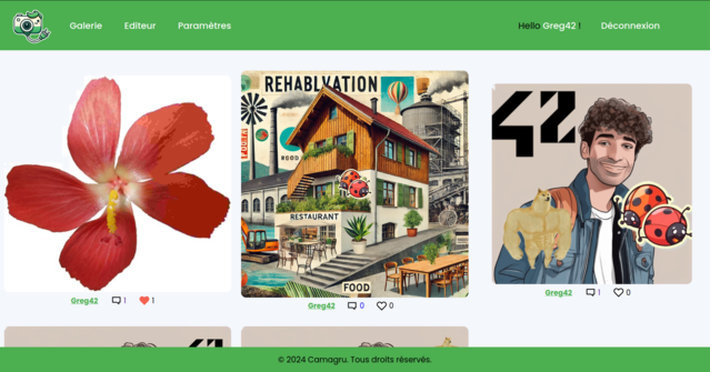 L'utilisateur peut prendre une photo à partir de sa webcam ou importer une image, y ajouter des stickers issus d'une liste et publier le rendu. Toutes les images finales sont publiques, peuvent être aimées et commentées.