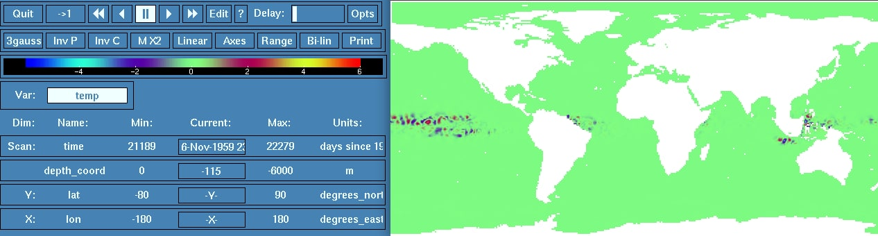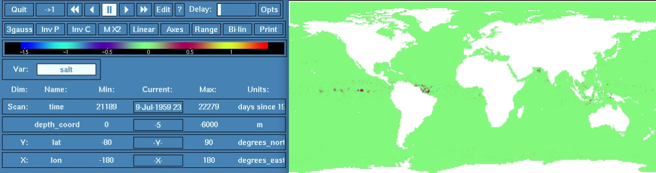 The differences of upto approx. +-2 Kelvin / +-1 psu in temp / salt are most prominent in top layers near the equator and travel westwards in waves.