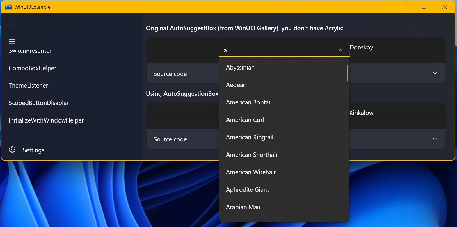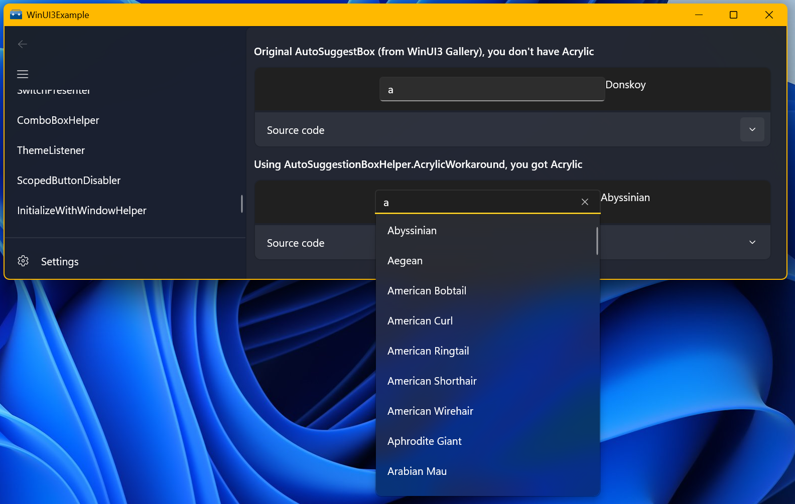 The WinUI3's built-in AutoSuggestBox does not have Acrylic background. We fixed it for you. To use it, simply add AutoSuggestBoxHelper.AcrylicWorkaround="True" as an attached property on your AutoSuggestBox.