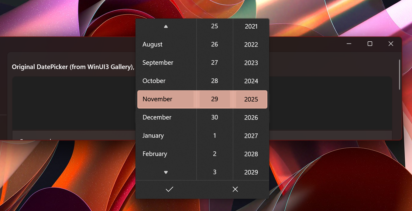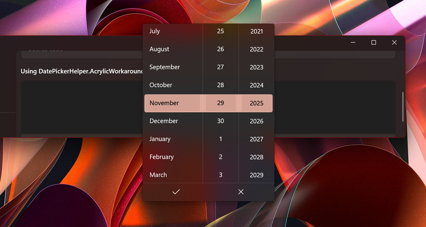 The WinUI3's built-in DatePicker does not have Acrylic background. We fixed it for you. To use it, simply add DatePickerHelper.AcrylicWorkaround="True" as an attached property on your DatePicker.