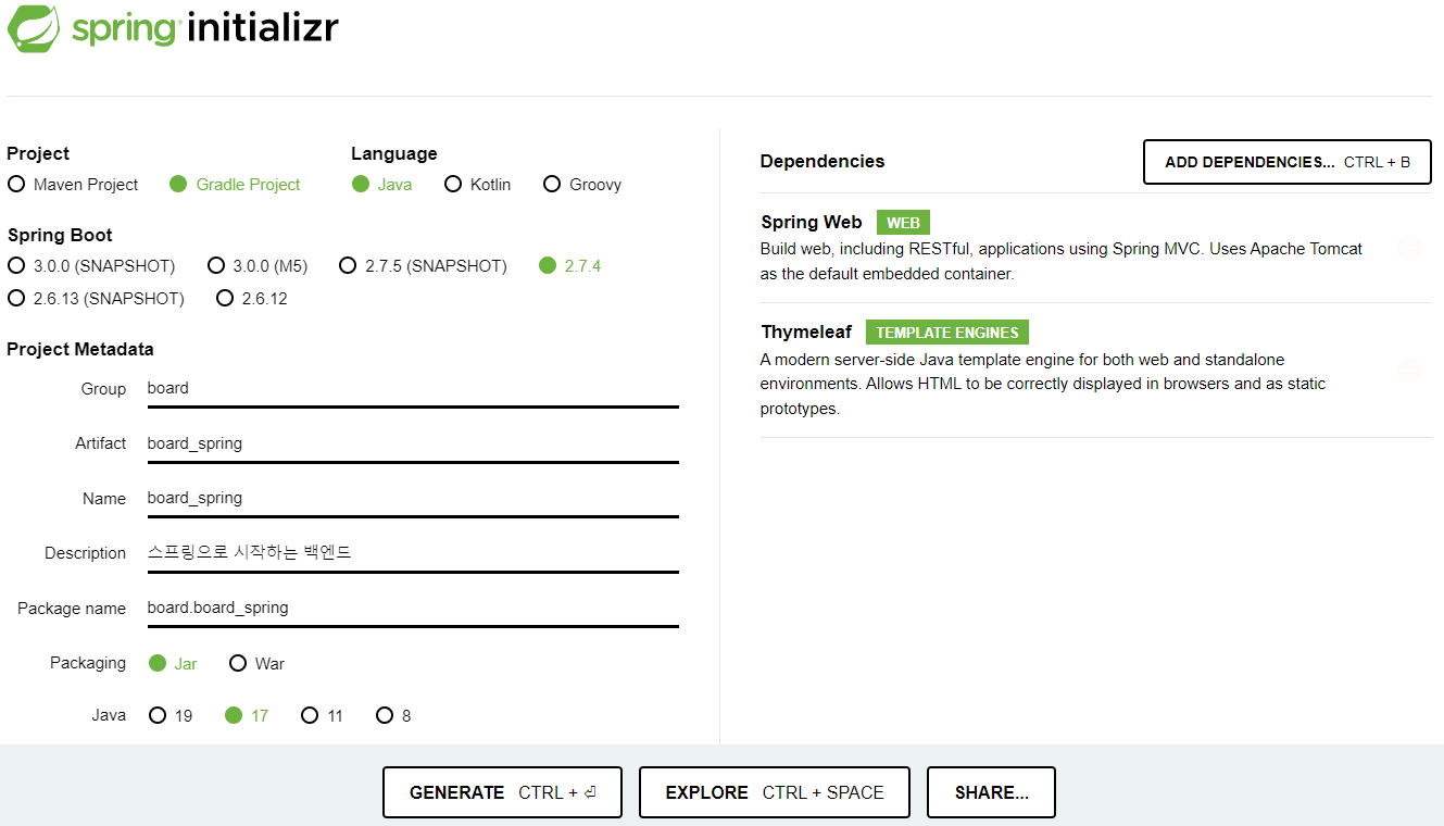 스프링 부트 스타터 사이트에서 스프링 프로젝트 생성(https://start.spring.io)