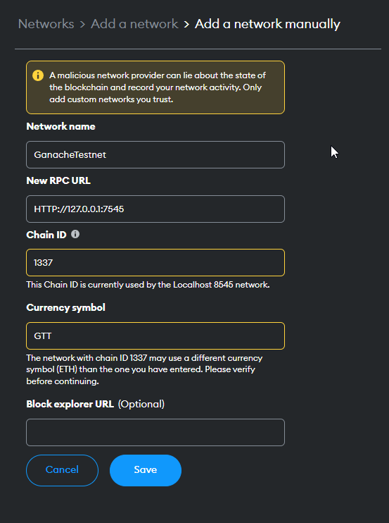 - Add network manually in metamask using the copied rpc url and chain id with any name and symbol.