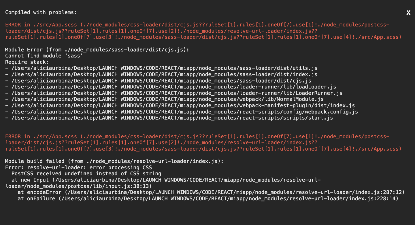 se supone que ya instalé el paquete de Sass pero al correr la app me sale esto.