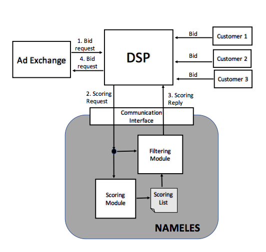 Figure 1 presents a high level representation of Nameles functional blocks. Moreover, the figure shows how Nameles could be integrated in the programmatic ad delivery chain as an auxiliary service for the DSPs. The only difference with respect to the current operation of a DSP would be that, as part of the pre-bid phase, the DSP makes a request to Nameles to provide a Confidence Score per bid request. To this end, the DSP sends a scoring request to Nameles (step 2 in Figure 3). The scoring request includes the following fields: bid request id (mapping Nameles result to the corresponding bid request), IP address of the device associated with the bid event and the domain offering the ad space. This information is included in the bid requests as defined in the openRTB protocol standard. The scoring request is delivered to two independent modules of Nameles: the Scoring module and the Filtering module.