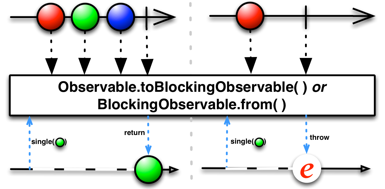 single( )— if the Observable completes after emitting a single item, return that item, otherwise throw an exception -