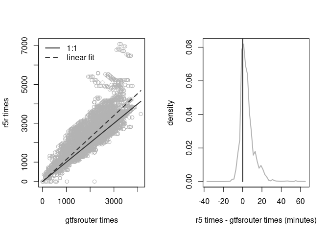 gtfsrouternow has a new turbo-chargedgtfs_traveltimesfunction, largely motivated by the support of the Mobility Institute Berlin, and the outstanding input of @AlexandraKapp. This issue is intended to document first comparisons against equivalent times generated from your amazingr5rpackage.Disclaimer: