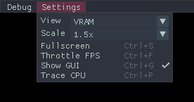 The UI elements other than the debugger windows are the initial Game Select screen and the Settings dialog.