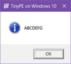 L"💯 TinyPE on Windows 10" /* lpCaption, 48 bytes */,
