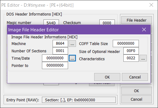 I opened PE Tools (v1.9.762.2018), clicked "PE Editor," and then opened tiny.exe.
