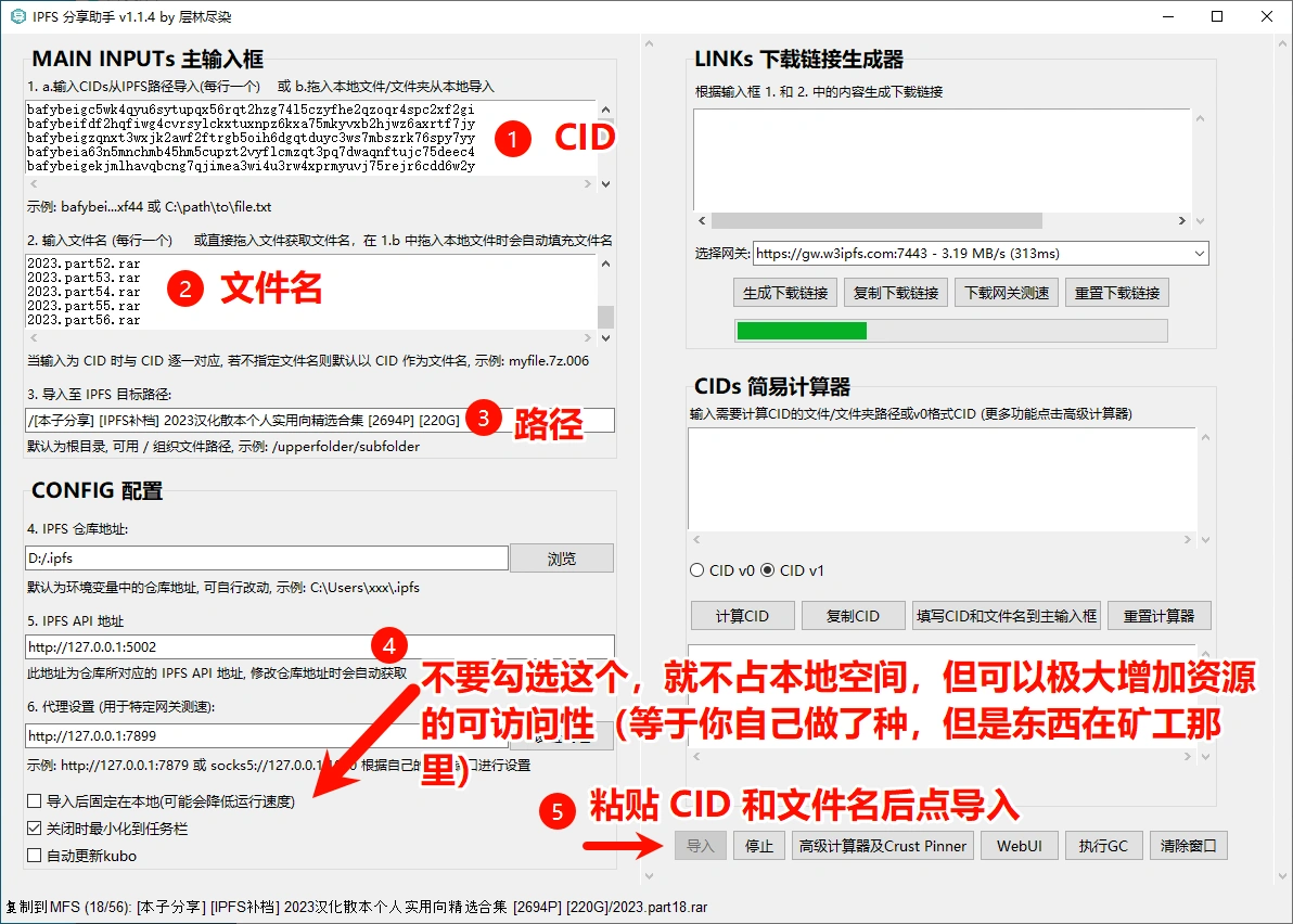 - 导入 CID 时可以点击【下载网关测速】广播所有 CID 到公共网关,这样可以改善导入效率