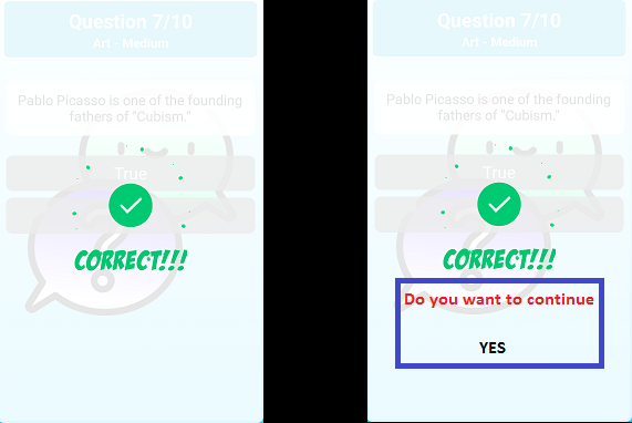 Now, there could a function that will be enabled on the setting/category interface, which will be created to check and uncheck. This function will ask if the user wants to continue/or always ask to continue. Users will enable if they wish to and disable if they don't want to use it. For instance, when a player selects 10 questions and press start, the game starts counting 10 sec per question if the player fails to answer within the time frame the game will be over. But when this feature is enabled, when the start game button is pressed, the game start and count the normal 10sec for the user to decide the answer, but after each question, the game will show if the answer is correct or incorrect with this option popping up like this.
