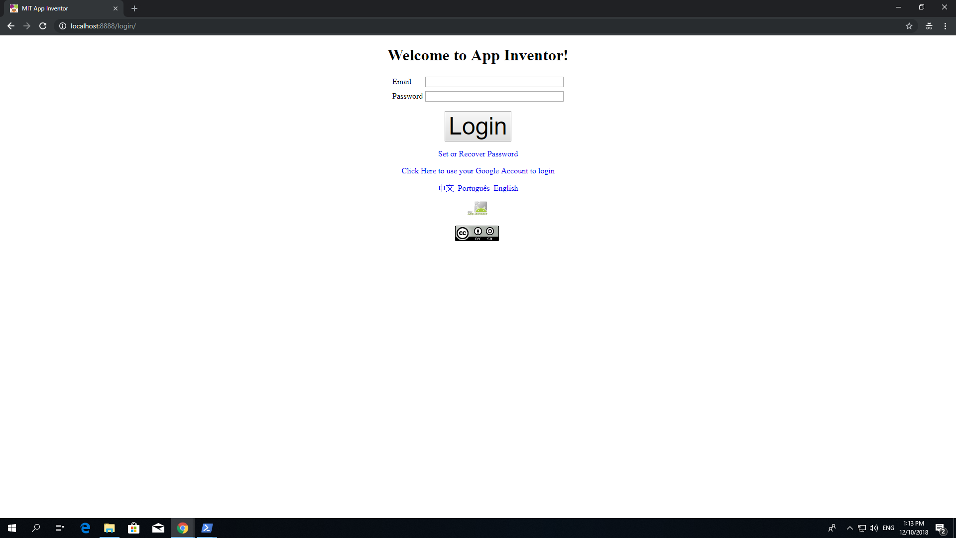 The App Inventor server is now started. Open the browser and go to http://localhost:8888, you should see your local version of App Inventor.