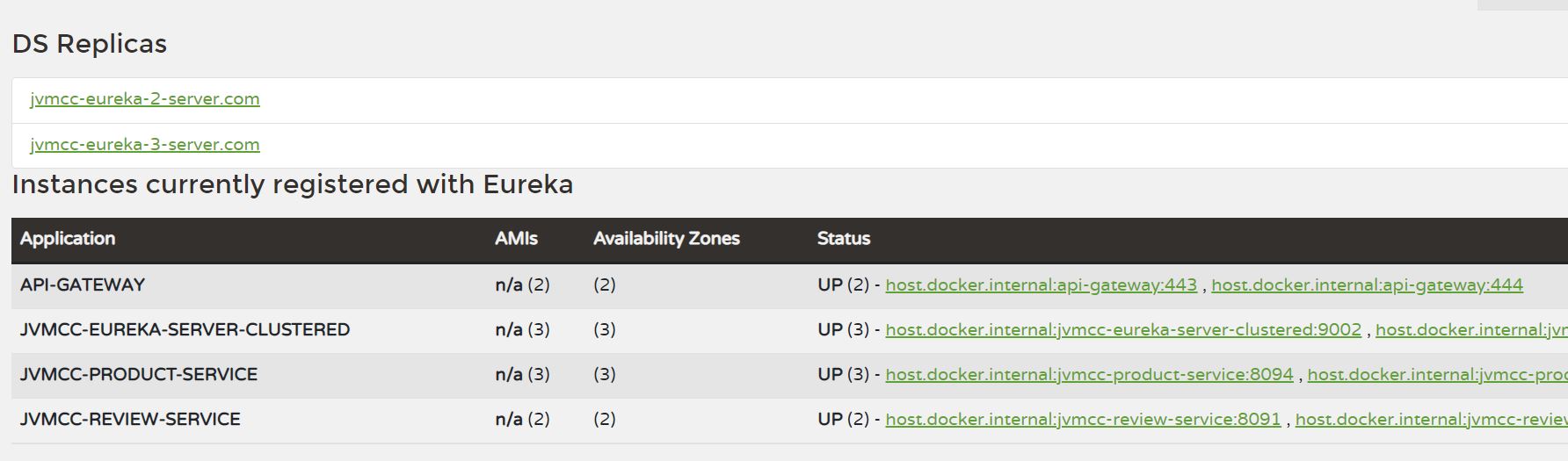 defaultZone: http://jvmcc-eureka-2-server.com:9002/eureka/,http://jvmcc-eureka-3-server.com:9003/eureka/Configure Eureka Clients for High Availability: