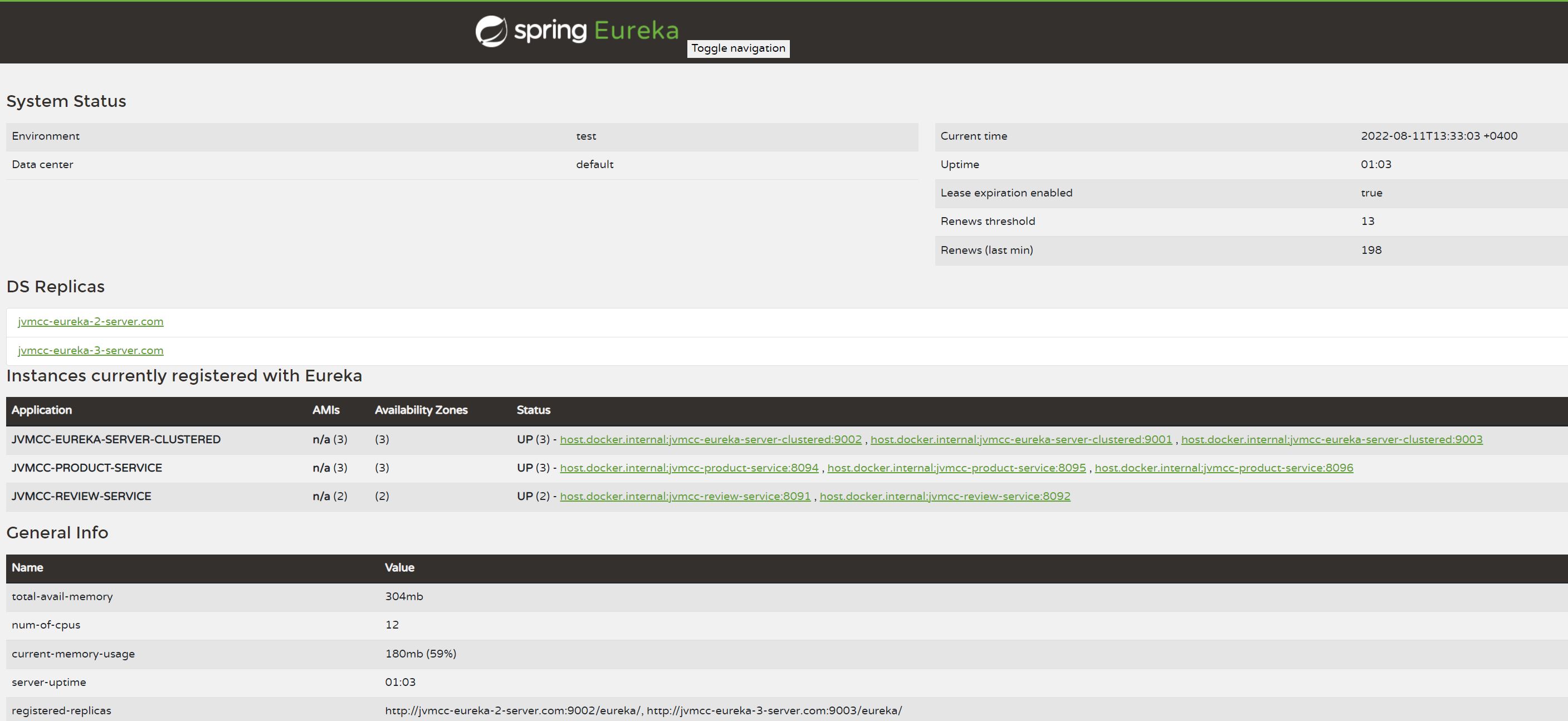 defaultZone: http://jvmcc-eureka-1-server.com:9001/eureka, http://jvmcc-eureka-1-server.com:9002/eureka, http://jvmcc-eureka-1-server.com.com:9003/eurekaTest the Eureka server without High Availability: