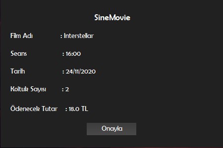 Cinema Booking - SineMovie Features For customers: Movie selection Seat selection Ticket information For admin: Add movies Delete movies uses mssql application language is Turkish Images of the application: Home screen Admin login screen Admin management screen Customer screen Seat screen Ticket information screen