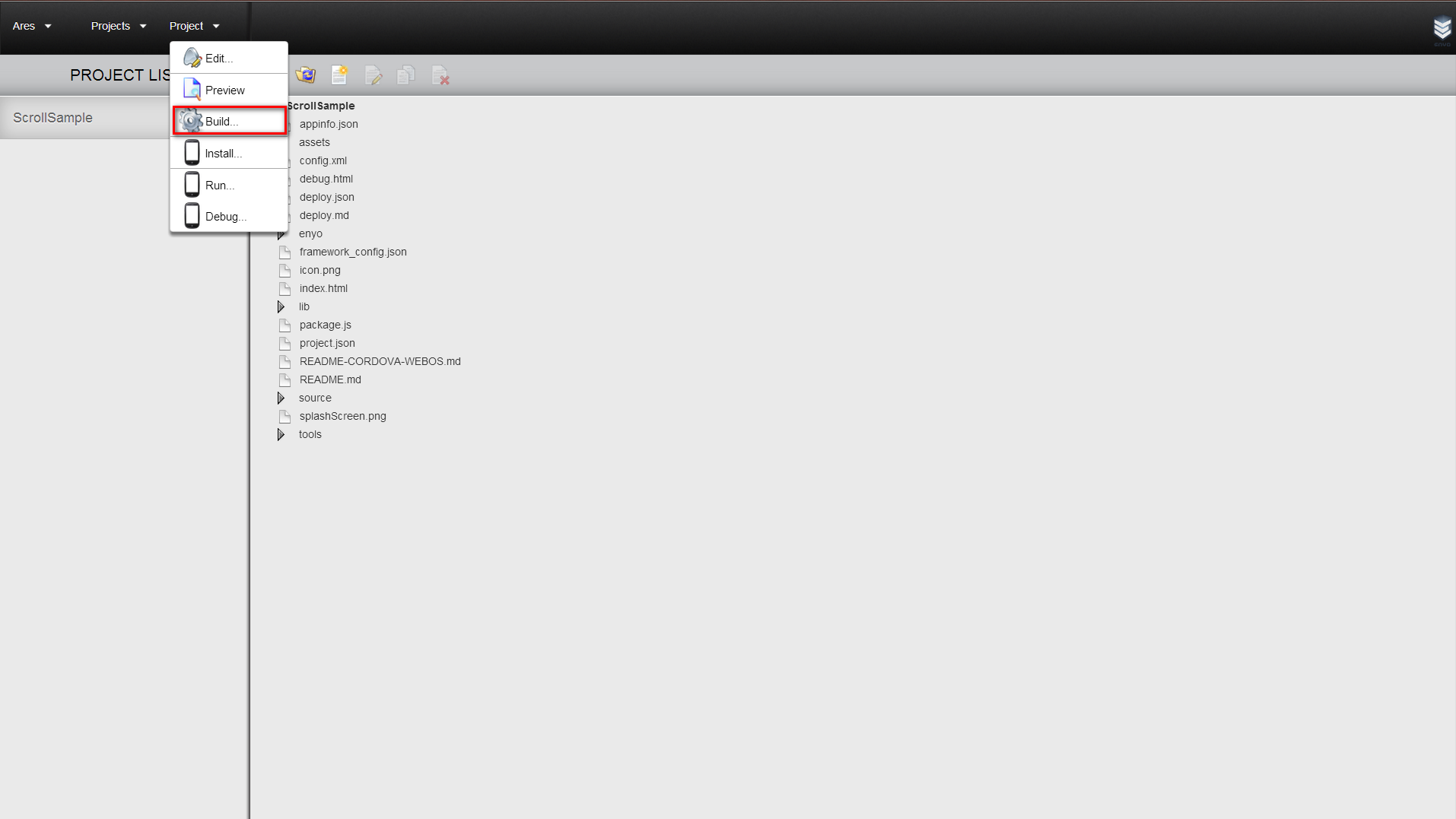 ##Uploading an Ares project into the Phonegap Build user account Ares IDE enables the user to build an Ares project using the PGB service, this can be done by selecting the build action as shown in the screenshot below: