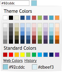 evol-colorpicker is a web color picker which looks like the one in Microsoft Office 2010. It can be used inline or as a popup bound to a text box. It comes with several color palettes, can track selection history and supports "transparent" color. It is a full jQuery UI widget, supporting various configurations and themes.