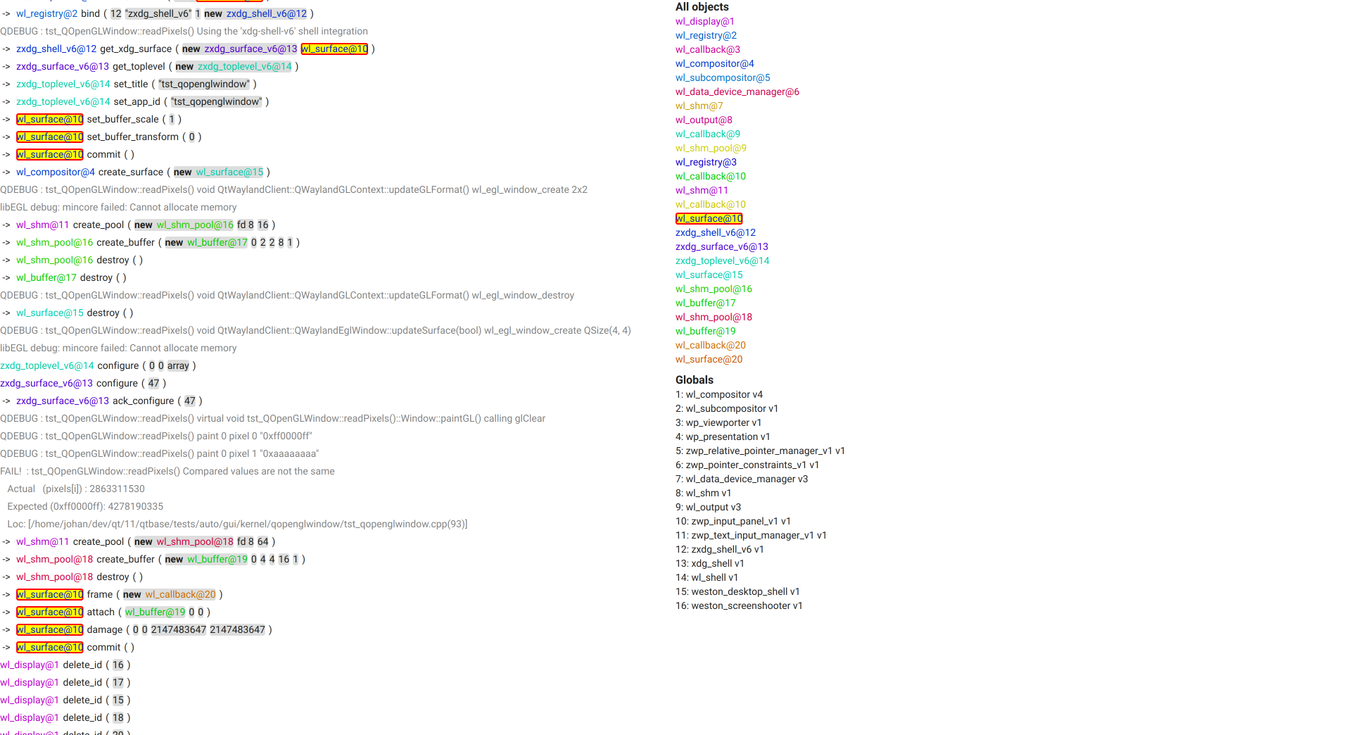 $ WAYLAND_DEBUG=1 weston-terminal 2>&1 | wayland-log-reader