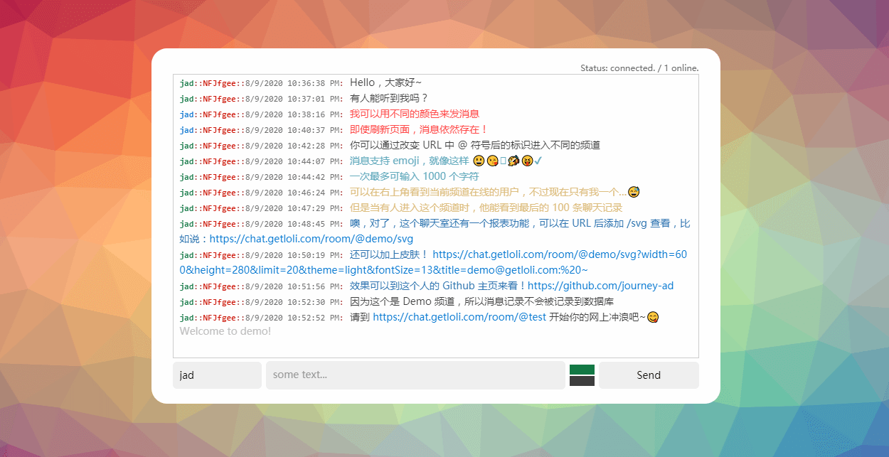 https://chat.getloli.com/room/@test/svg?width=750&height=360&limit=20&theme=light&fontSize=13&title=jad@github.com: ~