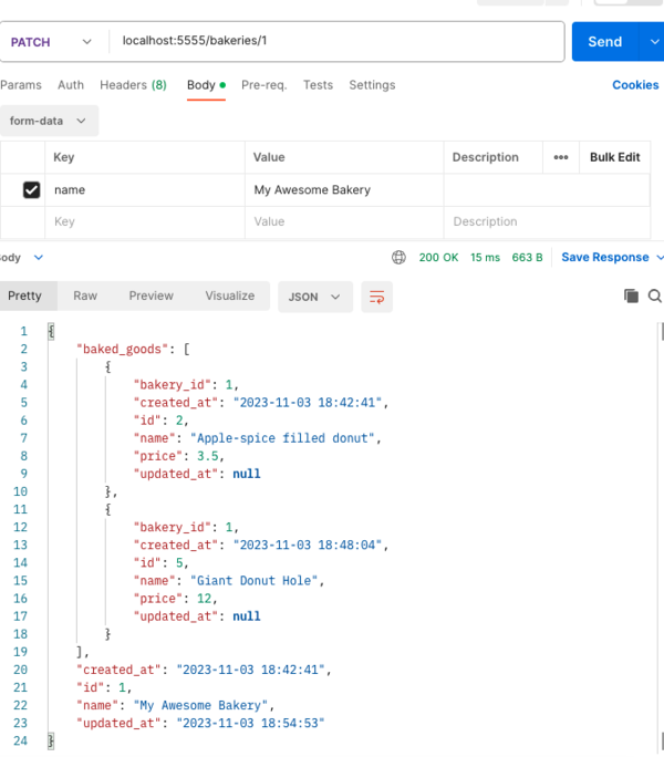 NOTE: You can use Postman to make get requests for bakeries and baked_goods before and after your post, patch, and delete requests to ensure the correct record is being added, updated, or deleted.