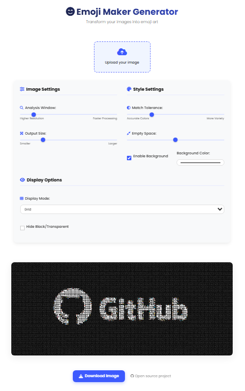 Emoji Maker Generator is a powerful web application that transforms your images into beautiful emoji art. Simply upload any image, adjust the settings to your liking, and watch as your photo is converted into an artistic emoji mosaic!