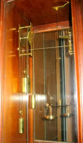 这个钟的原理是,内部有一个密封的玻璃盒,里面是28升空气。当温度或大气压发生变化,只要当天的温度变化超过 3.3°C,盒子里面的空气就会膨胀或收缩,从而拉动一个1磅的砝码1英寸的距离,为这个钟上发条。