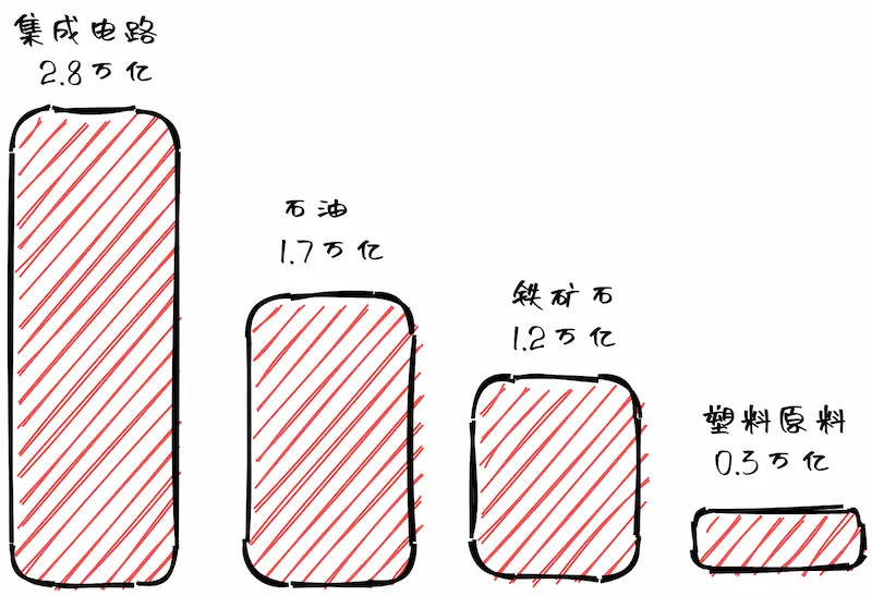 去年,中国进口最多的三样商品依次是集成电路、石油和铁矿石。