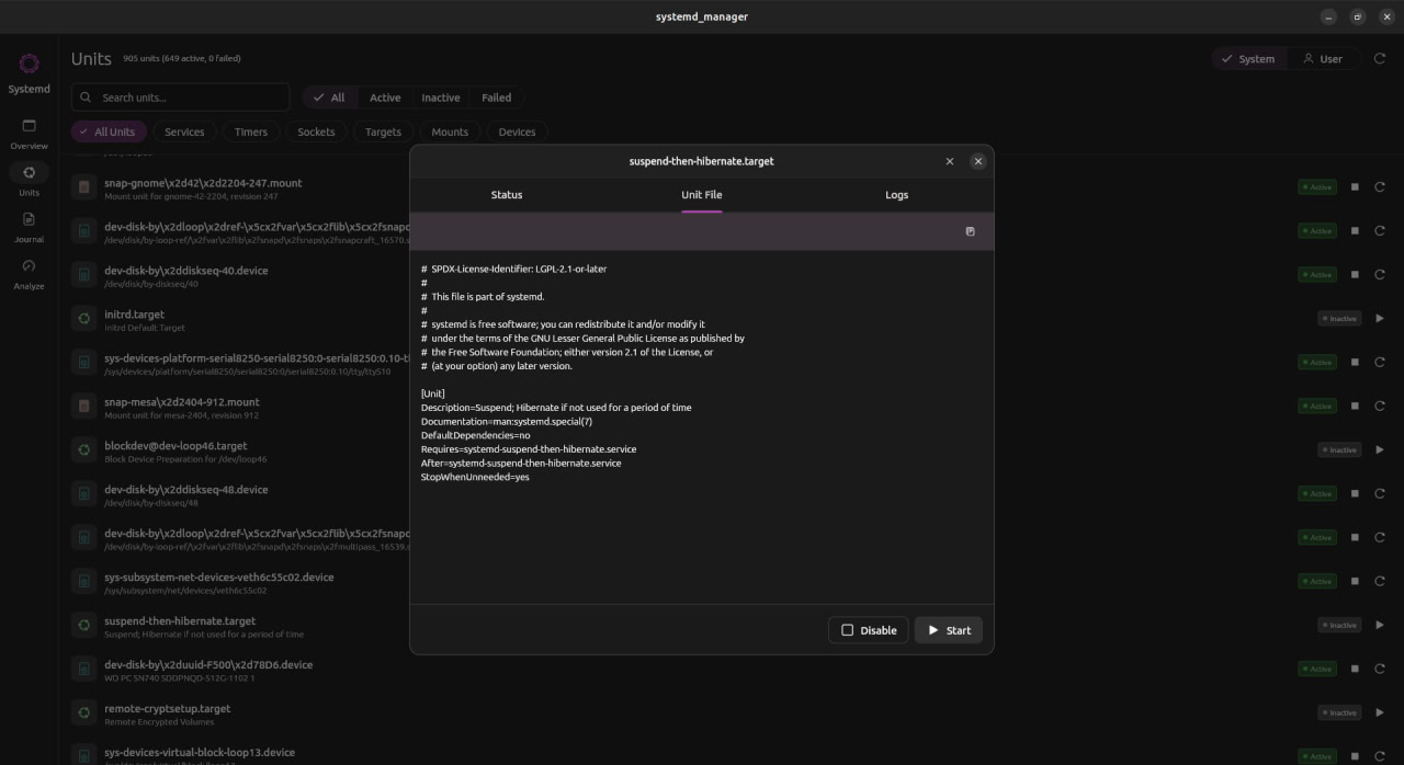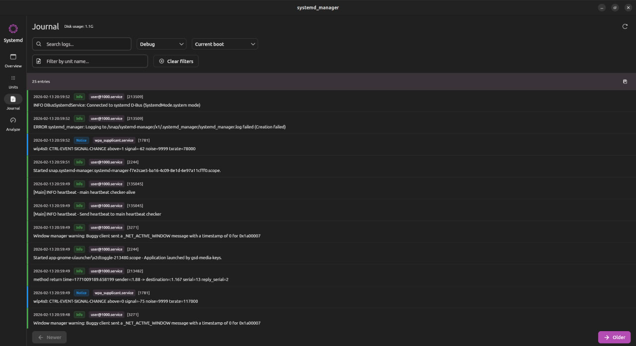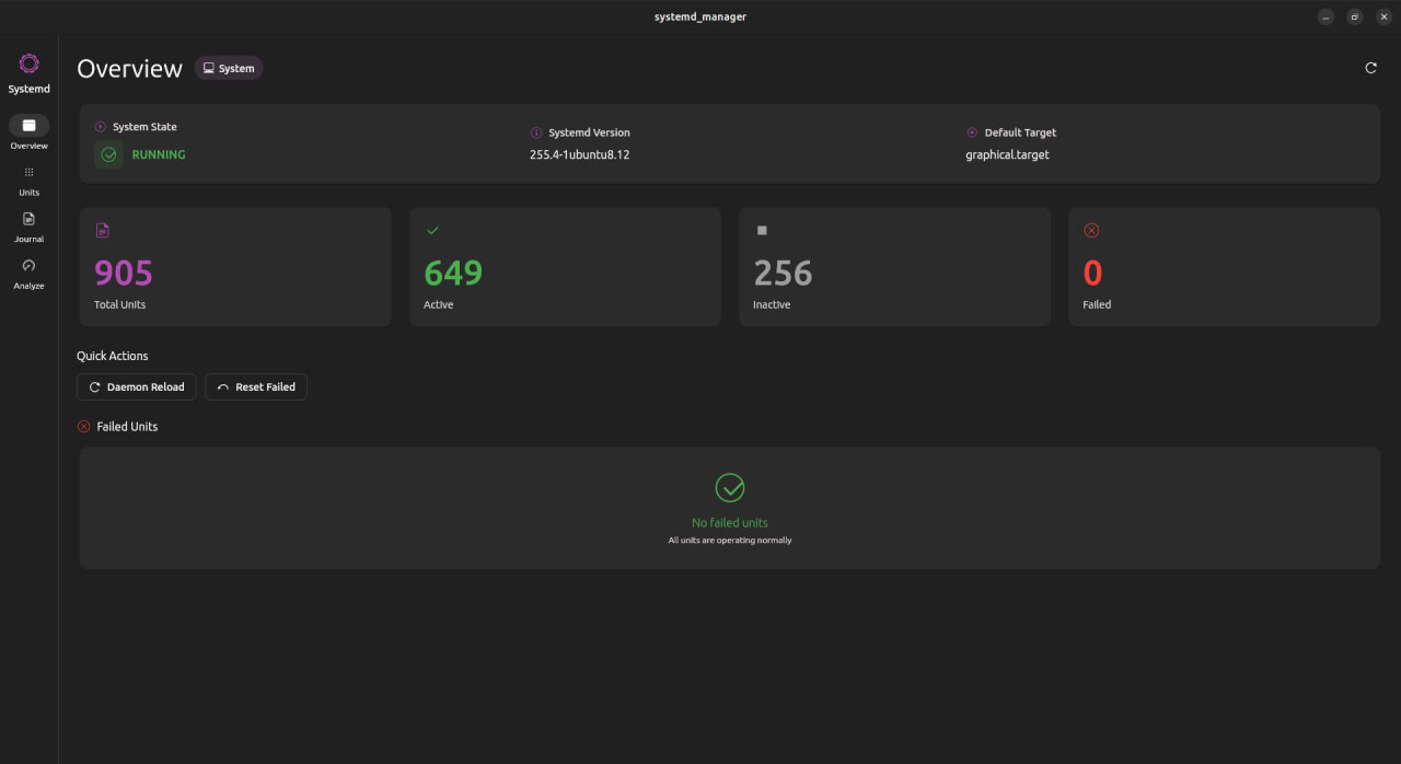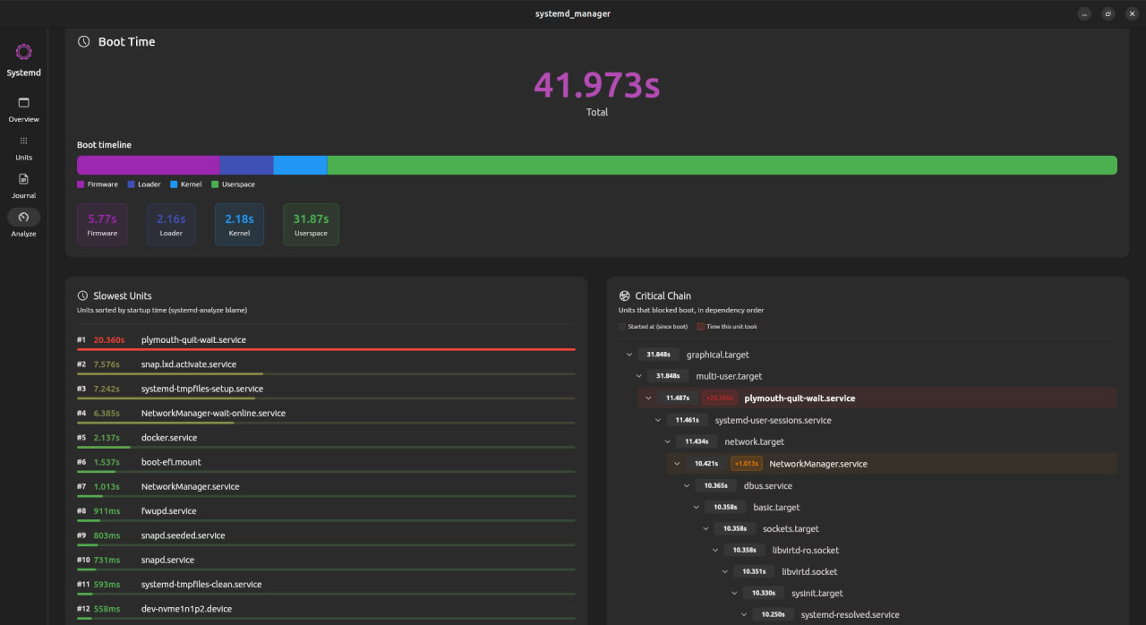 Linux desktop app for managing systemd units, browsing journal logs, and inspecting boot performance. Built with Flutter/Dart using Ubuntu's Yaru theme.