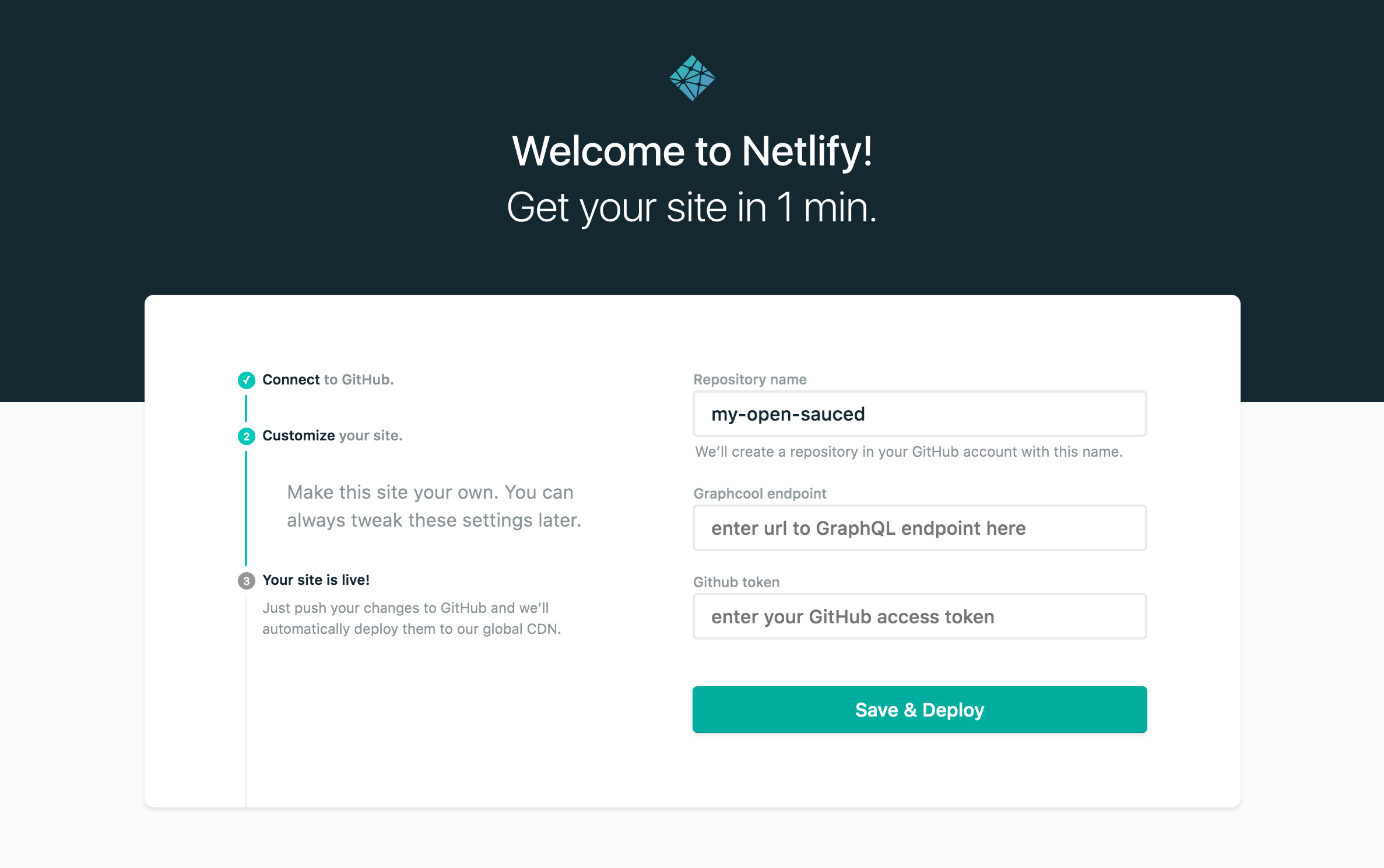 Click the deploy to Netlify button and add your GitHub access token and Graphcool Endpoint.