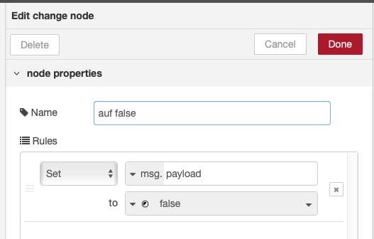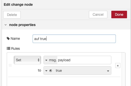 Nun wird jeder dieser Switch Nodes mit 2 Change Nodes verbunden. Der eine setzt auf true, der andere auf false.