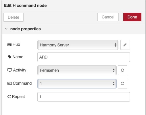 Mal legt einen HomeKit Switch Node pro Sender an, der mittels Delay Node und Change Node automatisch wieder auf false gesetzt wird. Diesen Switch Node verbindet man mit einem H Command Node, in dem man den gewünschten Befehl eingibt. Als Beispiel nur für ARD, was bei mir auf 1 liegt.