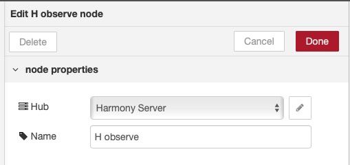 Man startet mit einem H Observe Node. Dort wählt man das gewünschte Harmony Hub aus.