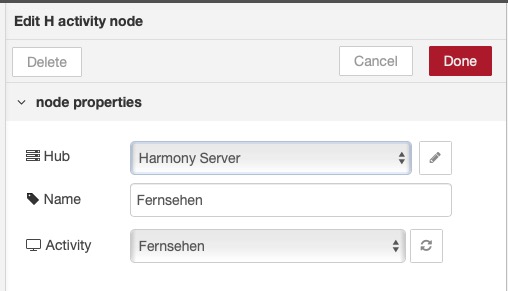 Als letztes nimmt man dann pro Activity einen H activity Node, weist diesem die gewünschte Aktivität zu und verbindet diesen mit dem jeweiligen HomeKit Switch Node. Jetzt wird auch beim Betätigen des Gerätes in der Home App oder mit Siri die Harmony Activity gestartet.