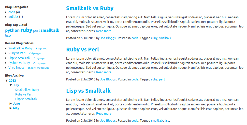 This screenshot shows some example blog entries with the widgets in the left sidebar: