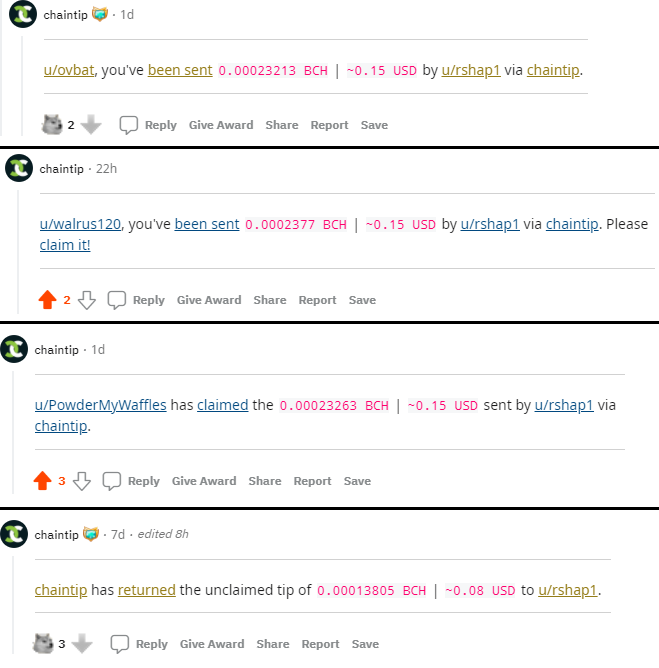 - Chaintip sends the recipient the Bitcoin Cash and edits the original comment to let everyone know the tip was claimed.