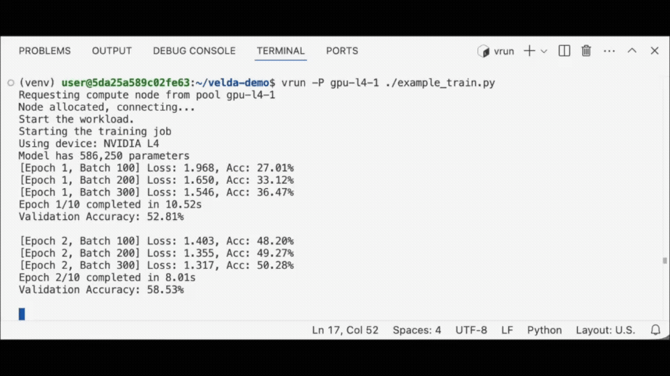 Prefix any command with vrun to execute it on cloud resources using the exact same code, data, and dependencies as your development machine.